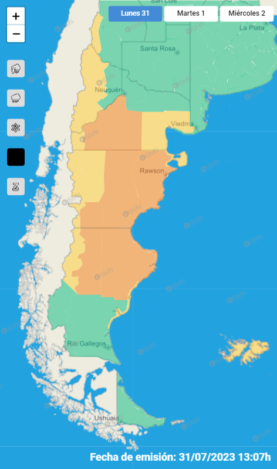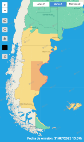 El Servicio Meteorológico Nacional emitió un alerta de nivel rojo por viento para la madrugada del martes 1 de agosto para la costa norte de la provincia de Santa Cruz y la costa sur y centro de la provincia de Chubut. Desde el mediodía de este lunes, los vientos se intensificarán, alcanzando su máxima intensidad hacia el final de esta noche y la madrugada del martes.