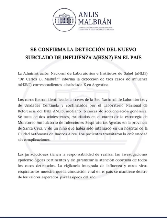 La Administración Nacional de Laboratorios e Institutos de Salud (ANLIS) “Dr. Carlos G. Malbrán” confirmó la detección de tres casos de influenza A (H3N2) correspondientes al subclado K en el país, identificados mediante técnicas de secuenciación genómica, según supo la Agencia Noticias Argentinas.