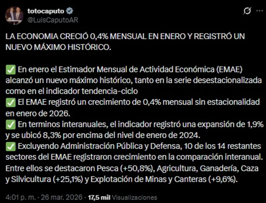 “En enero, el Estimador Mensual de Actividad Económica (EMAE) alcanzó un nuevo máximo histórico, tanto en la serie desestacionalizada como en el indicador tendencia-ciclo”, afirmó Caputo y añadió que “el EMAE registró un crecimiento de 0,4% mensual sin estacionalidad en enero de 2026”.
