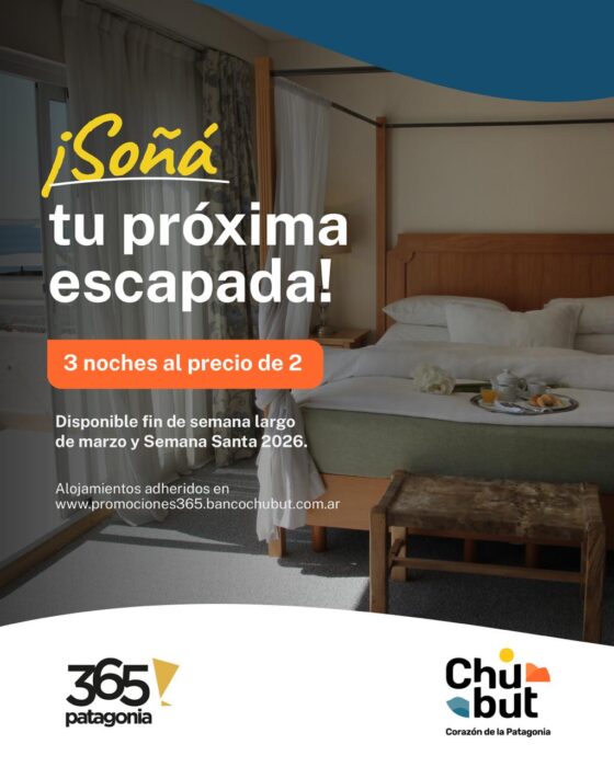 El Gobierno lanzó el programa “Soñá tu próxima escapada: 3 noches al precio de 2”. Para acceder, los interesados deberán acercarse a las oficinas de informes turísticos de las localidades adheridas: Esquel, Puerto Madryn, Camarones y El Hoyo.