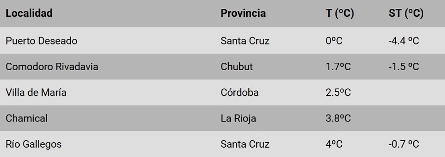 La ciudad chubutense registra 1.7ºC de temperatura y una sensación térmica de 1.5ºC bajo cero. Mientras que la localidad santacruceña tiene 0ºC de temperatura y una térmica de -4.4 °C.