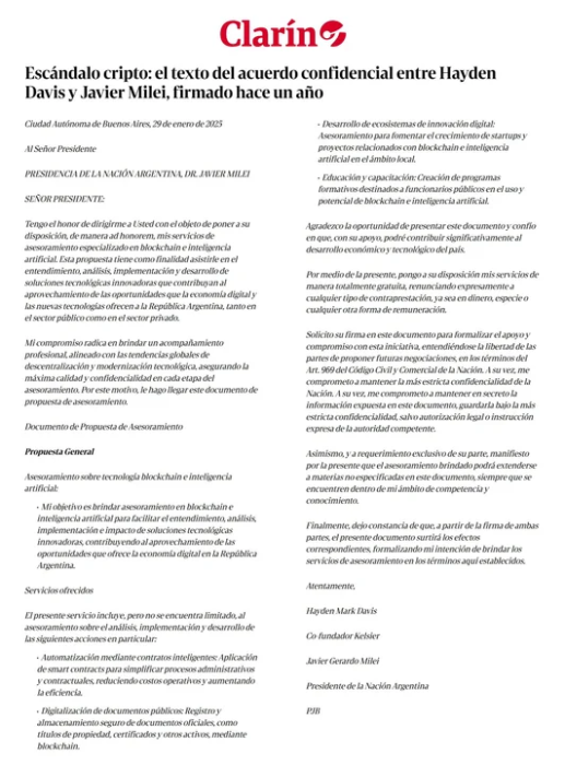 Un acuerdo confidencial firmado el 29 de enero de 2025 entre el presidente Javier Milei y el empresario cripto Hayden Davis revela que este último ofreció asesoramiento gratuito en blockchain e inteligencia artificial al Estado argentino, con énfasis en la confidencialidad y la posibilidad de futuras negociaciones.