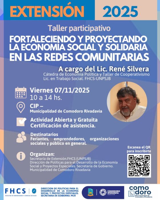Con la organización de la Municipalidad, a través de la Dirección de Políticas para el Desarrollo de la Economía Social y Proyectos Especiales, dependiente de la Secretaría de Gobierno, y en conjunto con la Secretaría de Extensión de la Facultad de Humanidades y Ciencias Sociales de la Universidad Nacional de la Patagonia San Juan Bosco (UNPSJB), se llevará adelante el taller participativo “Fortaleciendo y proyectando la economía social y solidaria en las redes comunitarias”, cargo del licenciado en Trabajo Social, René Silvera.