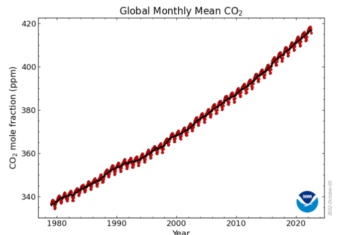 Figura 1.3. Fracción molar de la media mensual de dióxido de carbono considerando un promedio global sobre los sitios de superficie marina, desde 1980 hasta julio de 2022. Las líneas rojas y negras representan los valores medios mensuales, centrados en la mitad de cada mes. Para la línea negra se eliminó el ciclo estacional medio mediante un tratamiento estadístico. Fuente: https://gml.noaa.gov/ccgg/trends/global.html.