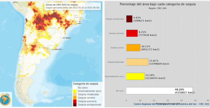 Figura 1.2. Izq: Zonas del CRC-SAS bajo alguna categoría de sequía, según precipitaciones del 01-01-2022 al 30-06-2022. Der: Porcentaje de área bajo cada categoría de sequía en el dominio del CRC-SAS. Para los cálculos se considera el territorio comprendido entre los 10 °S y los 46 °S. Fuente: https://sissa.crc-sas.org/monitoreo/estado-actual-de-la-sequia/.