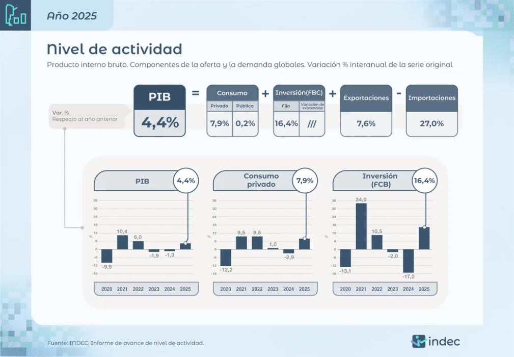 El Producto Interno Bruto (PIB) de la Argentina mostró un avance interanual del 2,1% en el cuarto trimestre (octubre-diciembre), y de esta manera cerró el 2025 con un crecimiento del 4,4%.