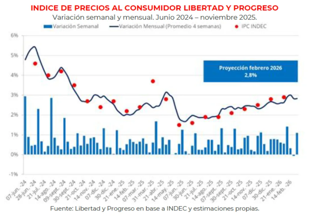 Clara Alesina, economista de la Fundación Libertad y Progreso, sostiene que en los últimos meses la inflación se aceleró por factores estacionales y por el rezago de la suba del tipo de cambio. En febrero vemos una leve pausa: proyectamos 2,8%, con desaceleración respecto a enero y el primer registro de desinflación semanal en nuestra serie.