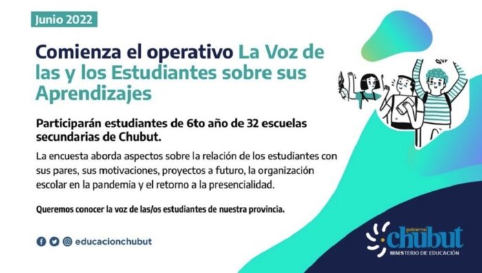 sábado, 4 de junio de 2022 - 6:00El Ministerio de Educación del Chubut, a través de la Dirección de Estadística y Evaluación Educativa, informa que durante este mes tendrá lugar el operativo de evaluación nacional “La voz de las y los Estudiantes sobre sus Aprendizajes 2022”.
