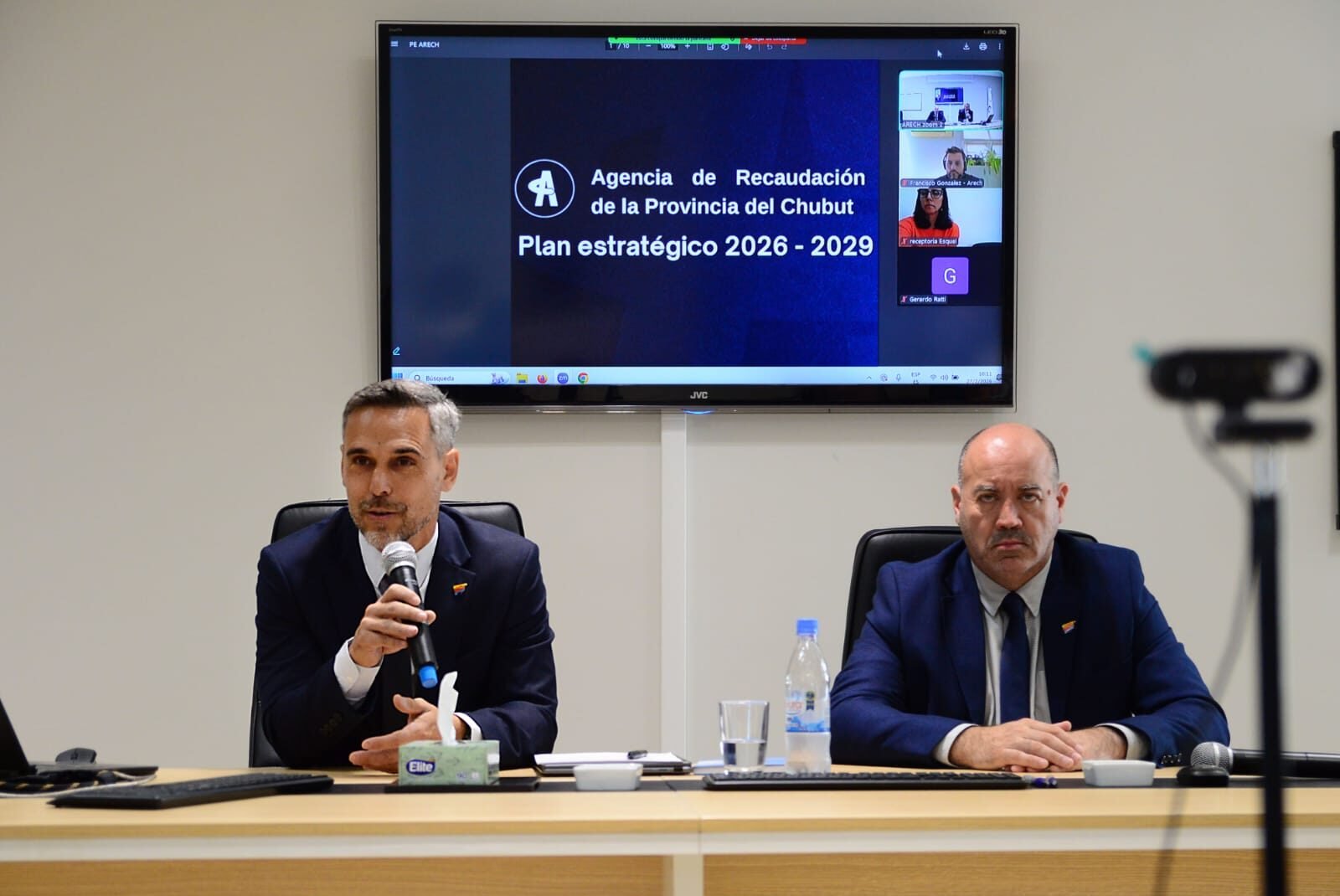 El director ejecutivo de la Agencia de Recaudación de la Provincia del Chubut (ARECH) Pablo Asnaghi y el sub director ejecutivo del organismo Guillermo Williams presentaron este viernes el Plan Estratégico 2026-2029, en un acto realizado en la sede del Consejo Profesional de Ciencias Económicas de Rawson.