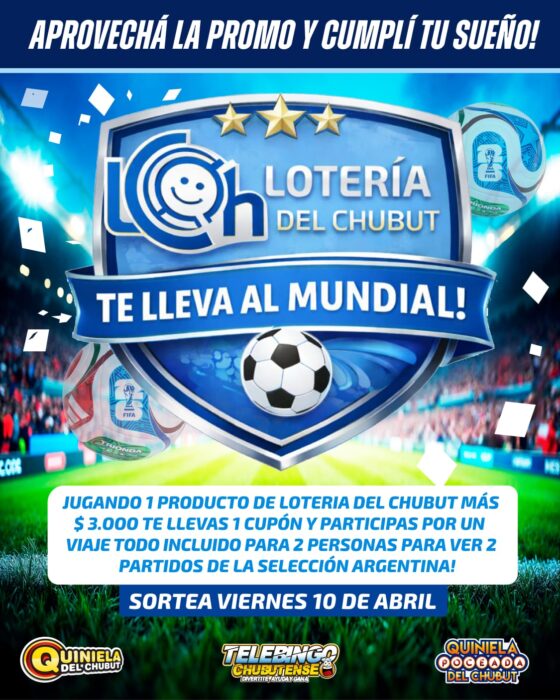Quienes jueguen a la Quiniela del Chubut, el Telebingo o La Poceada podrán participar por un viaje para dos personas a Dallas, Estados Unidos, con entradas para ver dos partidos de la Selección Argentina. Solo deberán agregar 3.000 pesos a su jugada. El sorteo será el 10 de abril.