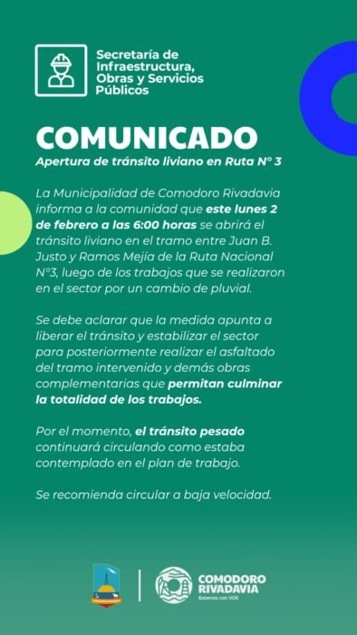 La Municipalidad de Comodoro Rivadavia informó que desde este lunes 2 de febrero quedó habiitado el tránsito liviano en el tramo comprendido entre Juan B. Justo y Ramos Mejía de la Ruta Nacional N°3, luego de los trabajos que se realizaron en el sector por un cambio de pluvial.