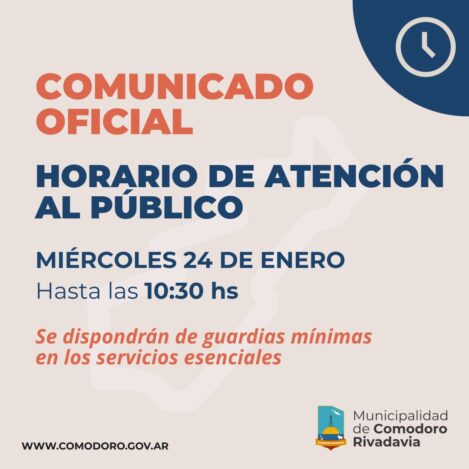 La Municipalidad de Comodoro Rivadavia anunció que el miércoles 24, día del paro nacional convocado por la CGT, sus dependencias permanecerán abiertas hasta las 10,30.