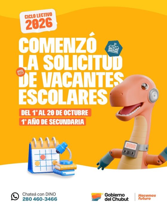 El Ministerio de Educación del Chubut comunica que ya se encuentra abierto el período de solicitud de vacantes para el ingreso a primer año del Nivel Secundario en el Ciclo Lectivo 2026. Las familias podrán completar el trámite de manera virtual hasta el 20 de octubre, a través del sistema DINO, comunicándose al WhatsApp (280) 460-3466.