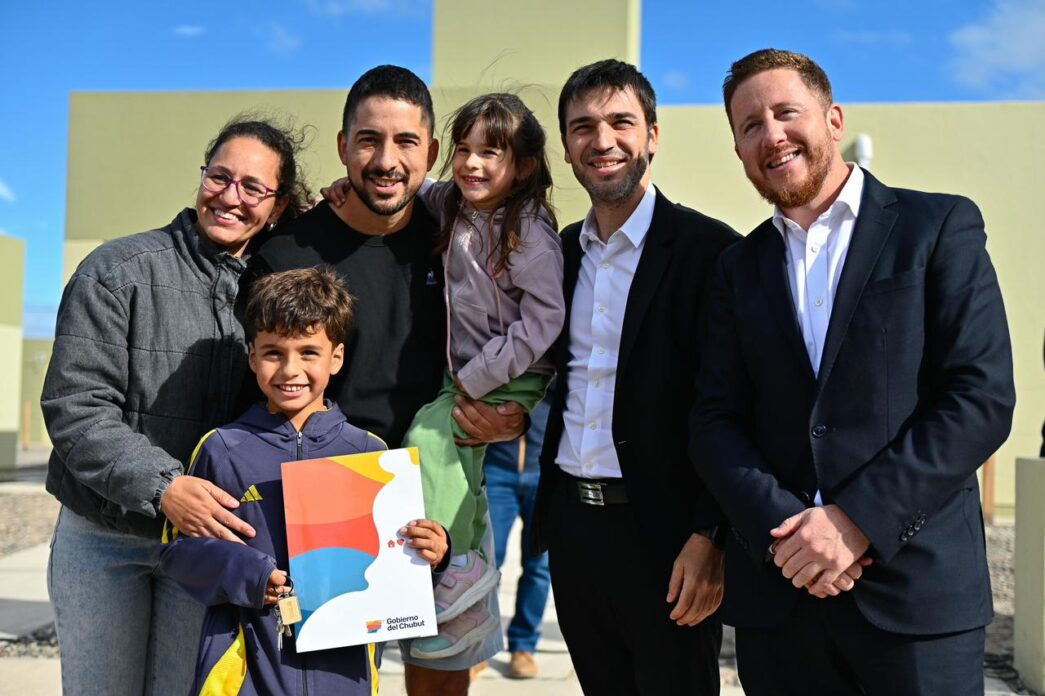 El gobernador Ignacio Torres encabezó una nueva entrega de viviendas, en este caso en la localidad de Dolavon, donde diez familias de la comunidad recibieron la llave de su primer hogar.